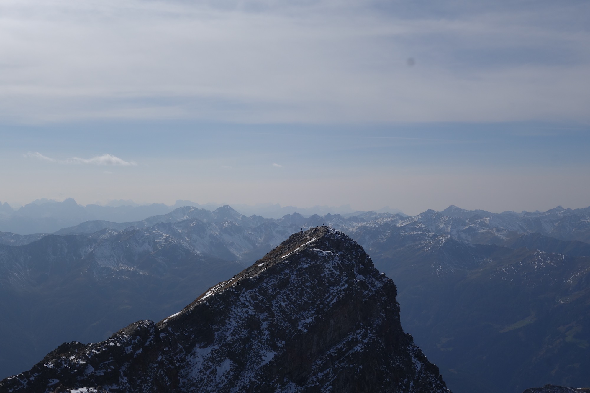 Reaching the peak was a liberation from our aching muscles and dogged tiredness. The panorama of the Alps unfolded beneath our feet as we took our last steps to the summit monument. We sat and drank in the view of hundreds upon hundreds of lofty mountain peaks. The clouds were slowly rolling in from the South creating islands of white tips and as the sun shone heavily on our back we felt at peace with the landscape around us. My mind was instantly soothed.